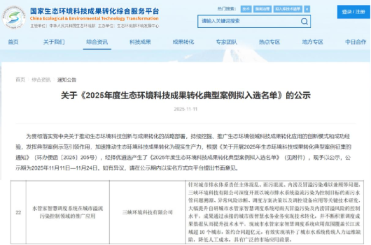本網訊(邵帥)近日,生態環境部發布2025年生態環境科技成果轉化入庫案例名單,三峽環科公司申報的“水管家智慧調度系統在城市溢流污染控制領域的推廣應用”成功入選。