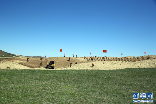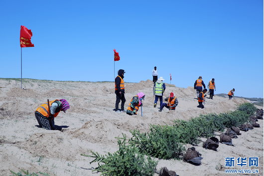 5月15日,工人在克什克騰旗境內的渾善達克沙地南緣扎沙障、種苗木。新華網石毅 攝
