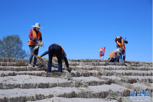 5月15日,工人在克什克騰旗境內的渾善達克沙地南緣鋪設沙障。新華網石毅 攝